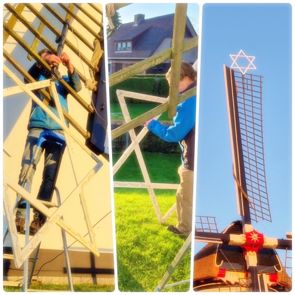 Het plaatsen van de kerstster in de wieken van de molen is een zorgvuldig en creatief proces dat traditie en feestelijkheid samenbrengt. Op de foto is te zien hoe geconcentreerd wordt gewerkt aan het bevestigen van de decoratieve licht ster op een van de wieken van een klassieke windmolen. De ster, in de vorm van een Davidster, wordt stevig vastgemaakt aan het uiteinde van de wiek, zodat deze goed zichtbaar is en veilig blijft zitten, zelfs bij wind.